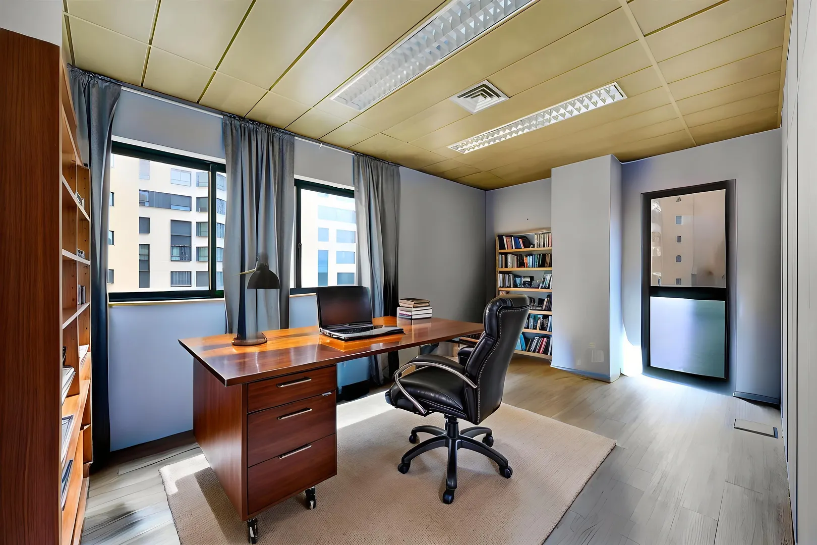 O espaço é composto por 6 gabinetes/escritórios, copa, economato e 2 casas de banho, uma delas com armários embutidos.